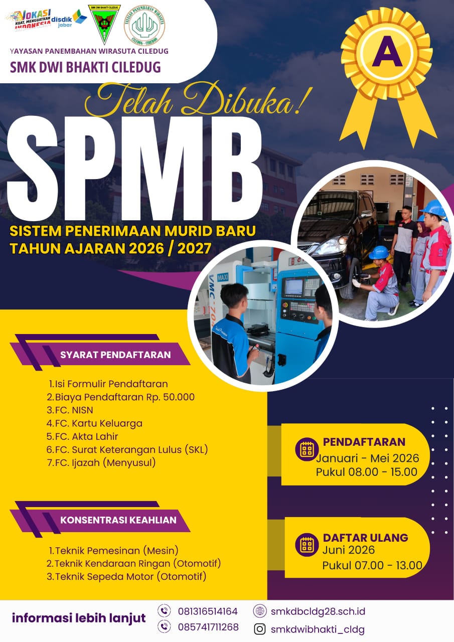 smkdbcld28.sch.id – 14 Januari 2026-Ciledug-Cirebon. Tahun ajaran baru sudah di depan mata. Pintu gerbang menuju pendidikan vokasi berkualitas kembali terbuka lebar. Sistem Penerimaan Murid Baru (SPMB) untuk Tahun Ajaran 2027/2028 di SMK Dwi Bhakti Ciledug secara resmi telah dimulai. Kami mengundang para lulusan SMP/MTs sederajat yang bersemangat dan berbakat untuk bergabung dalam komunitas belajar yang dinamis dan siap kerja.